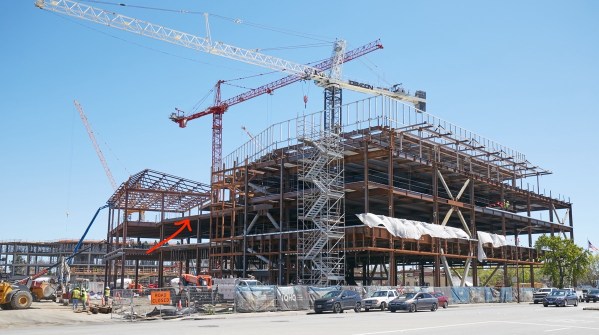 Building B may employ multiple styles, but it looks nothing like one of the two buildings whose structures are nearly complete on the east side of Main Street. Both of these are referred to in the preliminary plans as “building E”, likely because they both sit atop a common two-story subterranean garage. But the northernmost of the two — the closest to downtown Redwood City — is going to be unlike anything else in this development: