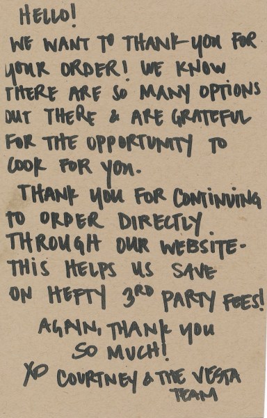 Last week I mentioned that Mazra had opened its Redwood City doors to great acclaim along the closed-off section of Broadway. At the time my wife and I paid them a visit, it was a bit on the early side — 5:30 p.m. — and I observed that the restaurants across the street seemed pretty quiet. While they hopefully got busier as the evening wore on, it did cause us to realize that we hadn’t patronized one of our favorite Redwood City restaurants in a while: Vesta. Accordingly, when a friend came to visit a couple of days later, we got take-out from Vesta. As usual, it was wonderful. And it was accompanied by a lovely little note that I thought was worth sharing: