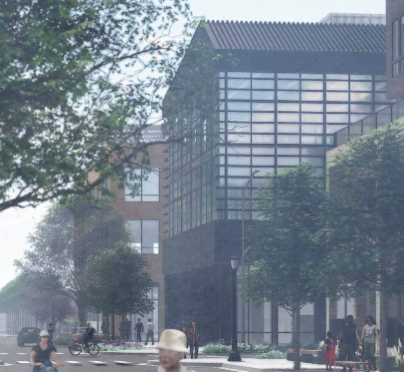 The colored renderings don’t really capture this building well, but the plans do also include some monochromatic aerial views, one of which shows this new building nicely: