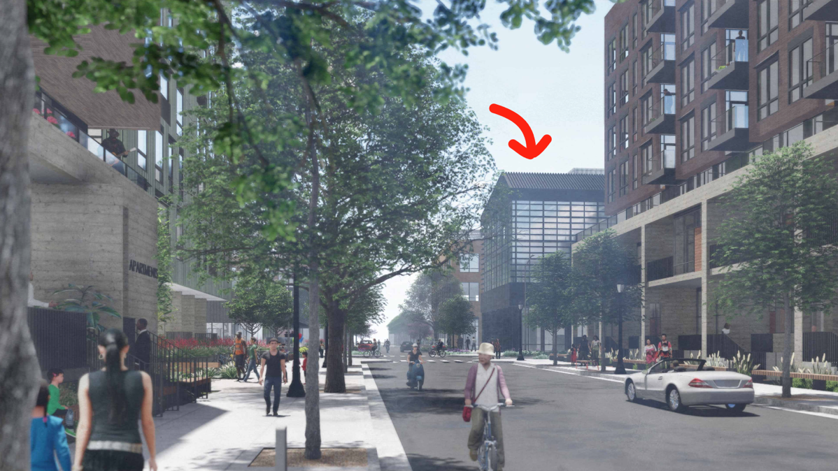One thing I really like about this project is the variety of building styles being used; these six buildings will all be different, and some of the buildings will even utilize multiple styles. The above rendering shows the view looking south down Lathrop Street, with one of the residential buildings against the right side of the rendering and the other residential building shown against the left. Building B is farther down the street. Note how the part I’ve highlighted looks somewhat industrial? Then see what appears to be a separate building beyond it? Allow me to zoom in: