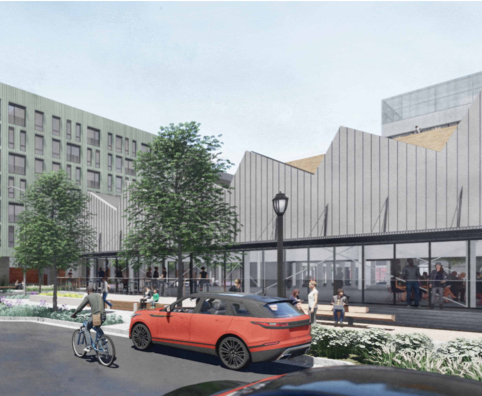 For those who aren’t already familiar with the ELCO Yards project, that little free-standing building in the center of the rendering is meant to echo the large metal shed that once stood on that spot. This little building will be constructed later, once the office building behind it is much farther along, and will be a restaurant, somewhat replacing (and intended to be run by) the folks who brought us Main & Elm, the restaurant that operated on Elm Street (near Main Street) until it was torn down to help form the site for one of the future residential buildings. This new restaurant will of course be open to the public, and as you can see it will open out onto a nice-sized public open space that will undoubtedly get a lot of use.