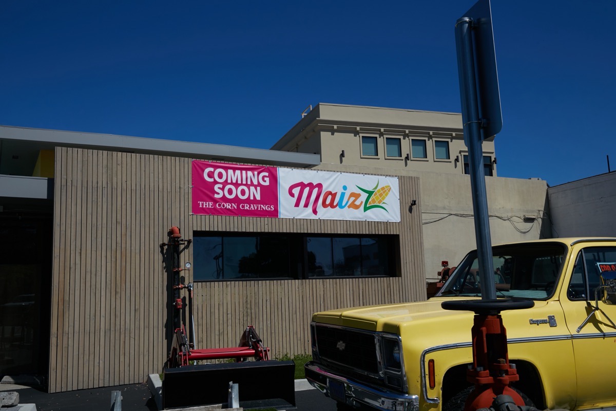 I’ve been watching what used to be the Signarama building ever since mid 2016, when that business relocated. The building, which sits at the corner of El Camino Real and Winklebleck Street (at 851 El Camino Real) sat idle for a handful of years, but finally, in early 2020, I noted that the building was getting remodeled. At the time I dug around a bit and came up with two interesting tidbits: it was slated to be a restaurant, and the restaurant would apparently be called “Maizz.” Between then and now I’ve learned little else, but watched as the on-again, off-again remodeling of the building took place. Finally, there is light at the end of this now four-year tunnel: a temporary sign (perhaps made by Signarama?) has gone up on the building: