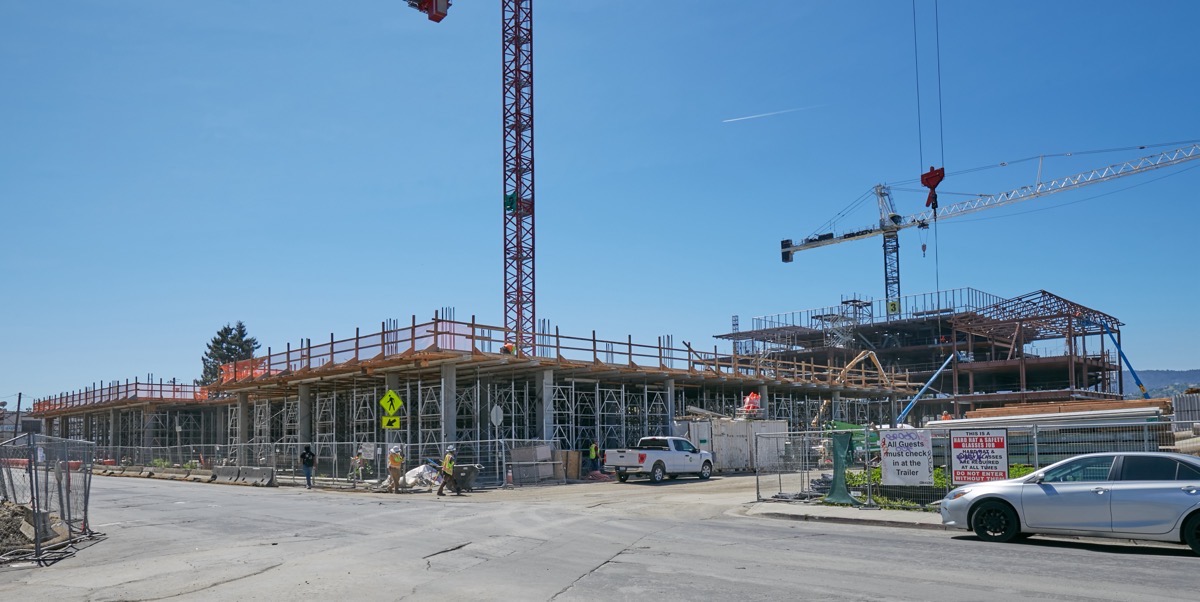 Building B may employ multiple styles, but it looks nothing like one of the two buildings whose structures are nearly complete on the east side of Main Street. Both of these are referred to in the preliminary plans as “building E”, likely because they both sit atop a common two-story subterranean garage. But the northernmost of the two — the closest to downtown Redwood City — is going to be unlike anything else in this development: