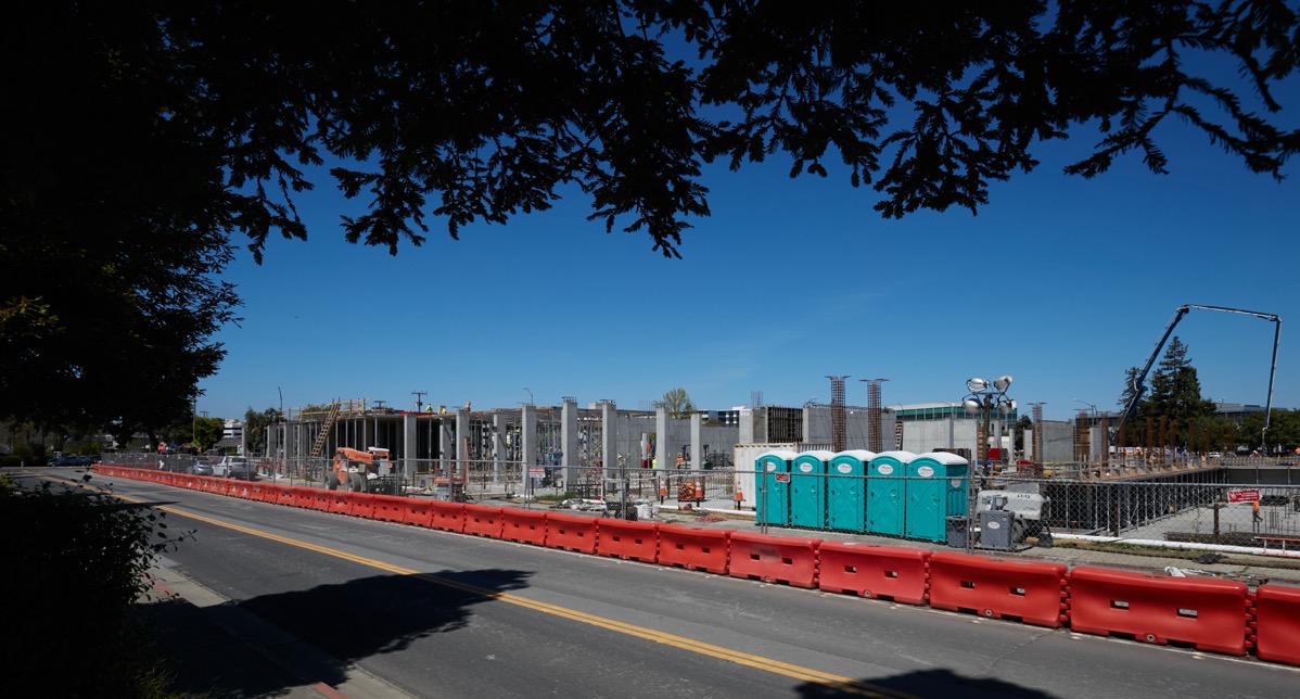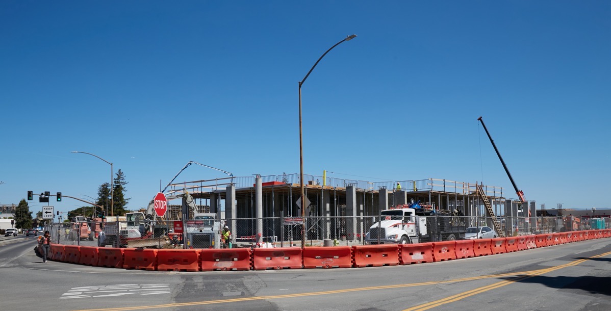 On to ELCO Yards. This project, sitting as it does along both El Camino Real and Main Street in Redwood City, is extremely hard to miss. Ultimately it will consist of four office buildings and two residential buildings (well, three, if you count the already built affordable housing building at 1304 El Camino Real), but for now the development effort is being concentrated on the four office buildings, with the site of the two residential buildings being used for staging of materials and equipment. This week I spent time studying the progress of each of the four buildings, all of which are making great strides. Perhaps the most interesting, at least for now, is the four-story office building out on El Camino Real (“building B”).