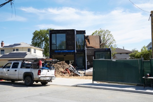 Although this project continues to make progress, it is going surprisingly slowly. It first came to my attention last August, when I caught site of, and then followed, a truck carrying some of the modules that have been assembled into the house you see above. The modules were unloaded and put into place that day, and I assumed that because the modules make up most of the finished house, that the remaining work would be completed in a matter of months. But it has been nearly nine months now, and the house has yet to receive its exterior finishes.