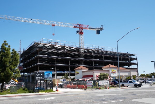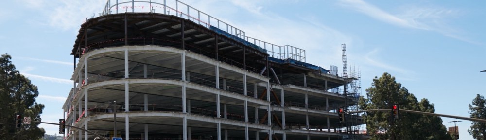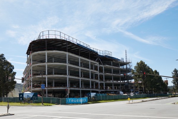 One final San Carlos project still beckoned: Portal 405, the large life science research and development building being erected on the northwest corner of Holly Street and Highway 101, just behind the In-N-Out Burger restaurant. The new building, which will consist of four stories of office space atop two levels of above-ground parking (and one level of below-ground parking; the garage in total will have room for 422 cars) appears to have reached the point where its steel structure is pretty much complete: