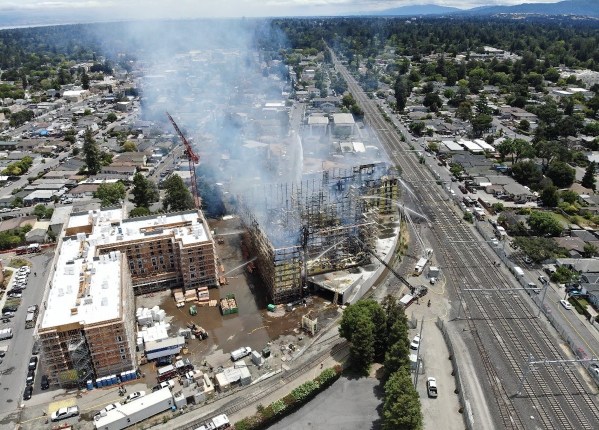That building was to be five stories, all built from wood, over a single-story concrete podium (the building that remains is four stories over a single-story concrete podium), and was to contain 104 affordable apartments of various sizes. As you can see, the wooden portion of that building, at least, was completely destroyed. Hopefully the concrete podium itself survived the fire, but in order to find out the burned remnants of the building will first have to be cleared away: