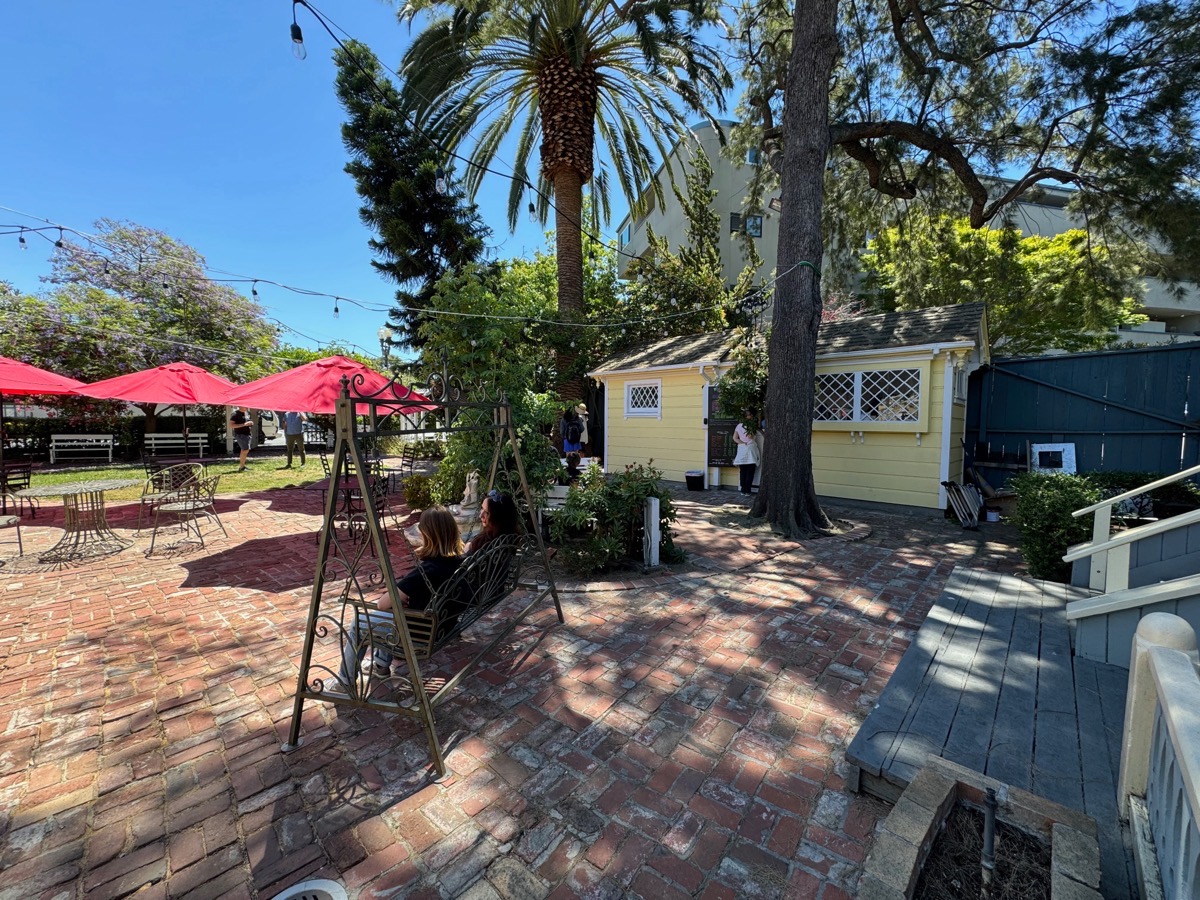 On Wednesday, I was delighted to be able to attend the soft opening of The Yard coffeehouse, at 1018 Main St. in Redwood City (next door to the main library parking lot at the corner of Main and Middlefield). The folks behind this new venture are still working hard to transform the yellow house (the historic John Offerman house, that for a time was home to The Main Gallery) into the business’s indoor venue, but currently they have their outdoor space all set up and are serving coffee, tea, lemonade, and a variety of other drinks from the “Carriage House,” a small yellow shed located across the yard from the Offerman House: