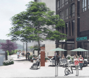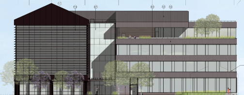 Over on Main Street, the ELCO Yards building that will stand at the corner of Main and Chestnut streets will have a very different, more industrial look. Much of the building will be clad in glass, although a portion will be somewhat barn-shaped and will be clad in glass and metal so as to look as if it is made up largely of louvers: