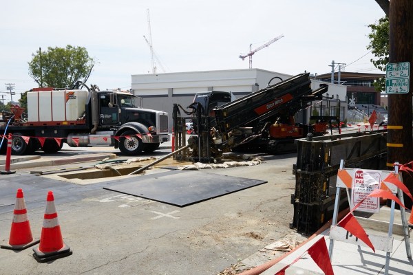 On the subject of Maple Street and the ELCO Yards project, as I surmised, Redwood City’s recycled water pipeline, which runs along the east side of Highway 101 and ducks beneath the freeway at Walnut Street, now runs beneath Walnut all the way to Savers (at the corner of Walnut and Stambaugh streets), at which point it makes a slight jog over to Maple Street, which it then runs beneath. If you’ve been wondering about the recent work going on beneath Maple Street just west of Middlefield Road, that is what is happening: the recycled water pipeline that will supply the portions of the ELCO Yards project with non-potable water (for landscaping, toilet flushing, and other uses where drinkable water isn’t actually needed) is just about to be extended to the corner of the ELCO Yards project itself.