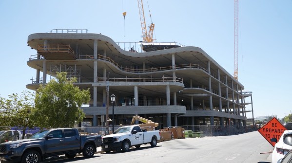 Ultimately, two taller (one six-story, one seven-story) residential buildings will join these four office buildings to make up ELCO Yards’ main campus. Recently some work has been going on near where one of those residential buildings will stand (at El Camino Real and Maple Street) but after some observation and thought I’ve come to realize that what is being worked on is not the building itself, but a portion of the plaza that will front the building at that corner and that will hold a piece of public art of some sort: