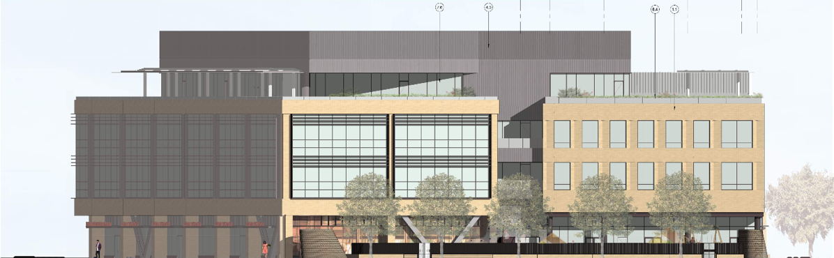 Over on Main Street, the ELCO Yards building that will stand at the corner of Main and Chestnut streets will have a very different, more industrial look. Much of the building will be clad in glass, although a portion will be somewhat barn-shaped and will be clad in glass and metal so as to look as if it is made up largely of louvers:
