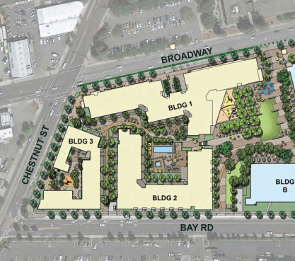 (Ignore the building in blue at the right edge of the rendering; that is an office building that will be constructed in a separate, later phase of the project.) In this image, Bay Road runs across the bottom, Chestnut Street runs up the left side, and Broadway runs near the top, at a bit of an angle. The developer has helpfully numbered the three buildings, with Building 1 facing Broadway, Building 2 facing Bay Road, and Building 3 mostly facing Chestnut Street (but also partially facing Bay Road).