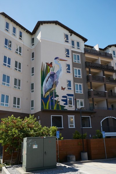 Like so many large murals, the folks behind this one had few choices as to where it could go. Thus, unfortunately, it is not visible to anyone driving by the building on either Main Street or Veterans Boulevard. While driving, the one place you can get a glimpse of it is when you cross over the bridge over Redwood Creek, leaving the Peninsula Boardwalk shopping center (where Kohl’s and Sports Basement are located). The best view, though, is reserved for those folks walking along the public walkway that runs between the 353 Main St. building and Redwood Creek (which is where I was when I took this picture). Just another benefit to exploring Redwood City on foot…