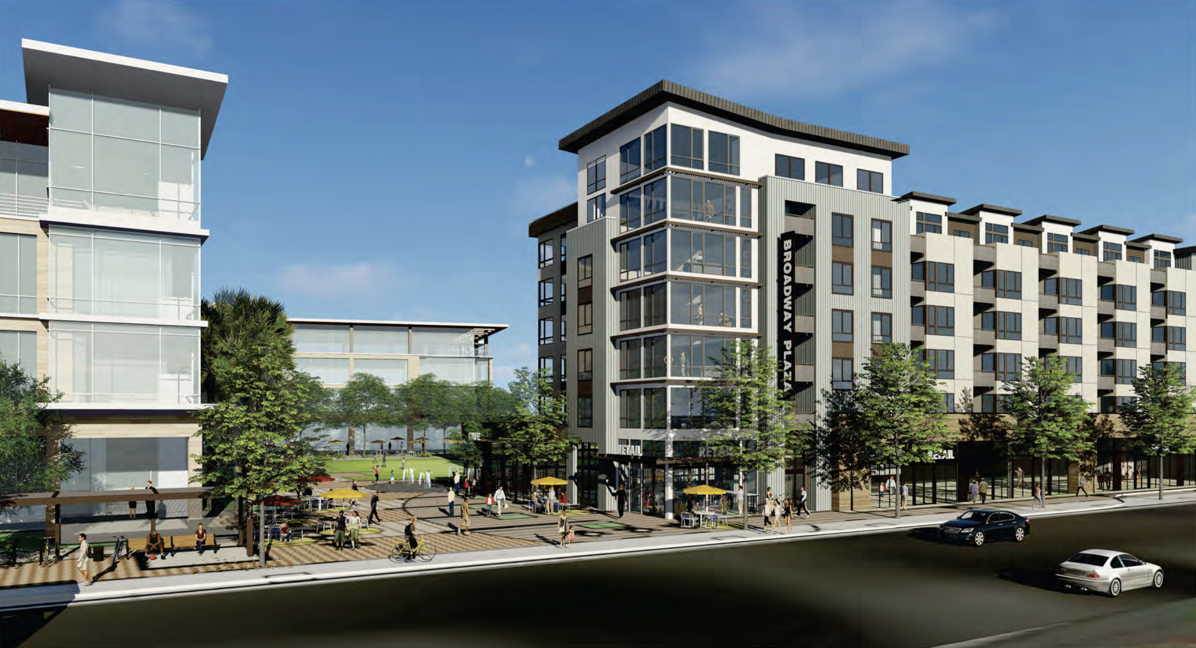 This rendering shows the entry into the public outdoor spaces from Broadway: