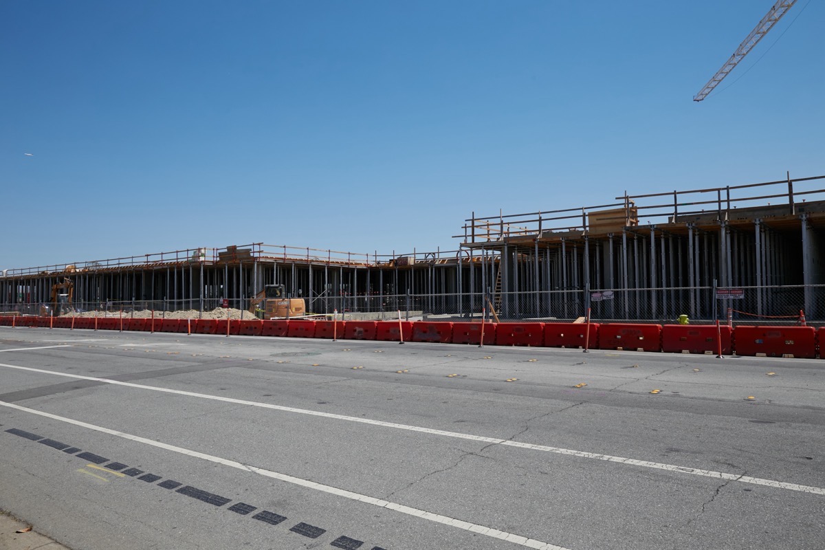 At this time, the podium level for Building 1 is just about complete: the concrete support pillars and the podium’s concrete top deck have mostly (or, perhaps, entirely; it’s hard to tell from street level) been poured, but the temporary supports have yet to be removed.