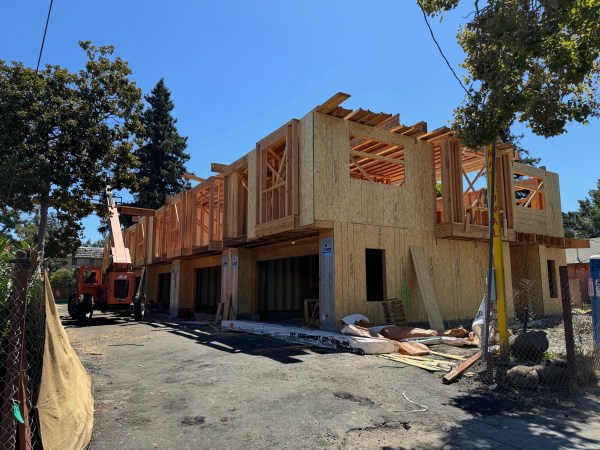 The eight-unit townhouse-style condominium development going up on the Woodside Road lot where Honey Bear Trees used to do business at Christmastime has passed the stucco stage, and is getting its final bits of trim before the exteriors are painted: