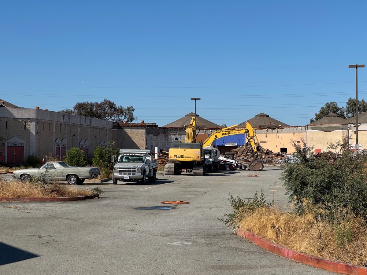 Sixteen years after its doors were closed for good, the Century Park 12 Theatres building, on E. Bayshore Road across Highway 101 from most of Redwood City, is finally coming down. Although I’m still unclear on why two separate permits were needed (one for the majority of the parking lot, granted weeks ago; and one for the building itself plus the portion of the parking lot closest to the building), the second permit was finally granted early last month, and now demolition of the building is well underway: