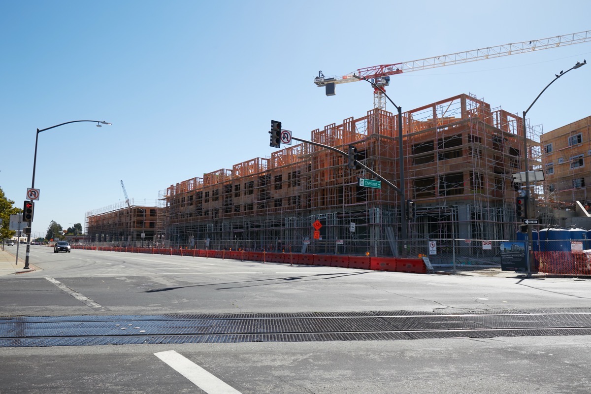 After paying a visit to Middlefield Junction, I came back up Middlefield Road into Redwood City and made my way over to Bay Road between Woodside Road and Chestnut Street to check on the progress of the Broadway Plaza project. I was pleased to see that the third of the three apartment buildings is now getting framed up (also on top of a concrete podium level that, here, primarily consists of an internal parking garage and the building’s lobby):