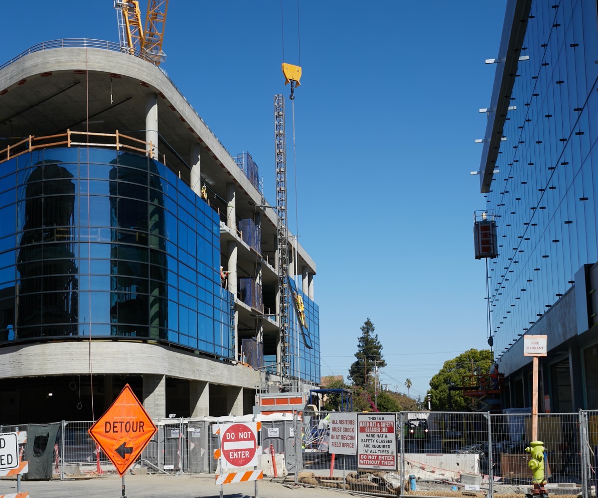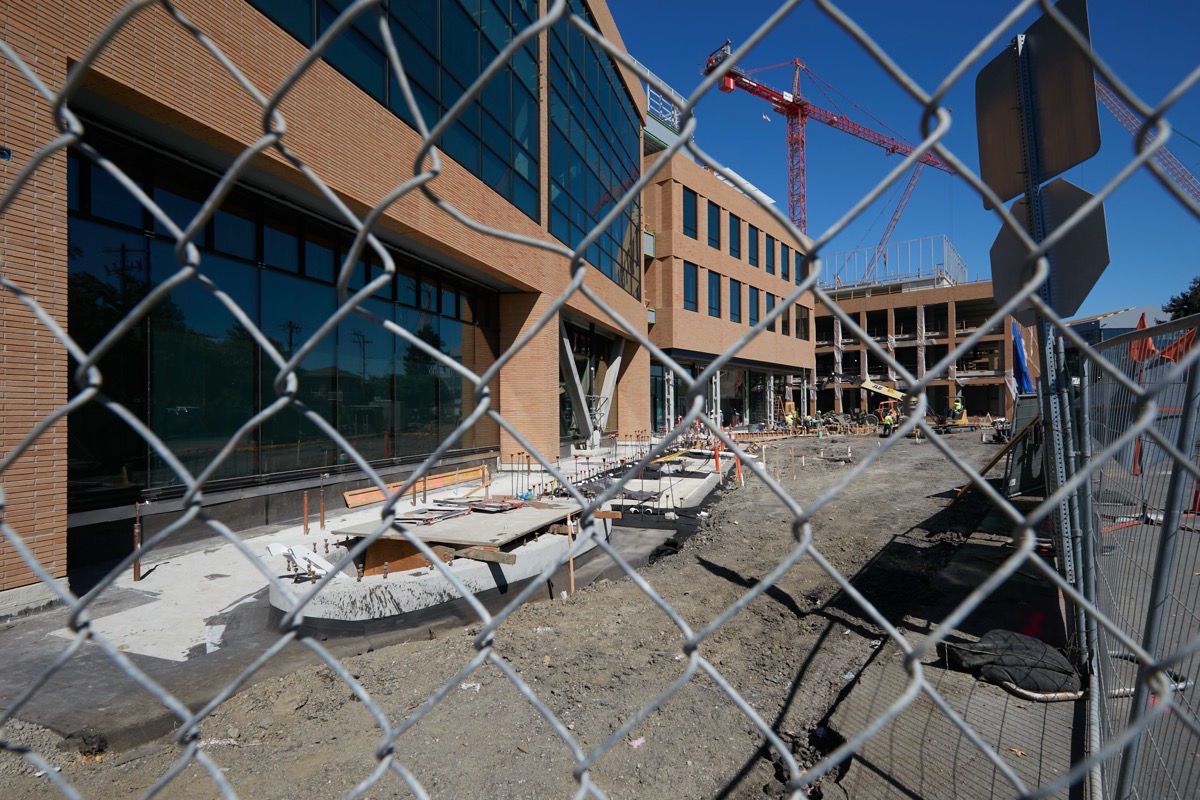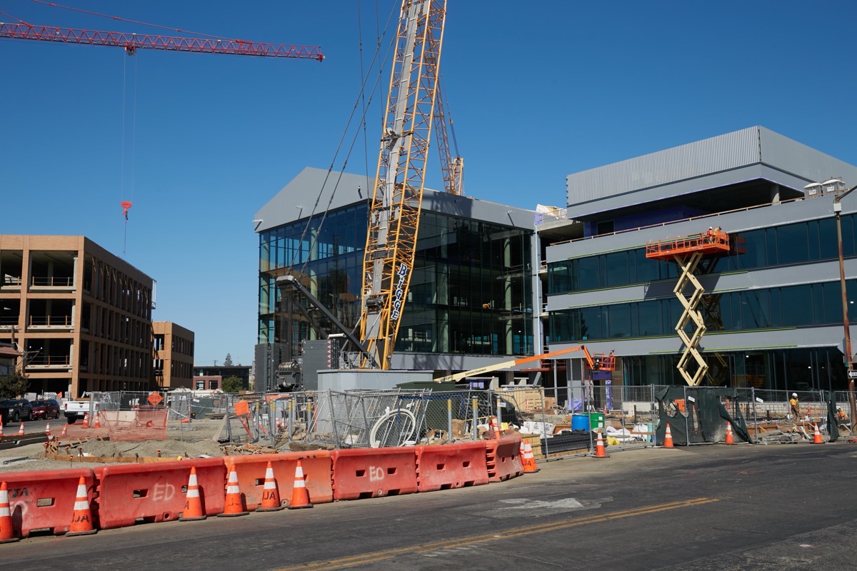 I’ve mentioned before that Beech Street, which connects Main Street and El Camino Real and runs behind this building, has been altered so that it now lines up with Lincoln Street on the other side of El Camino Real. Here is a picture over the construction fencing showing the modified portion of Beech Street: