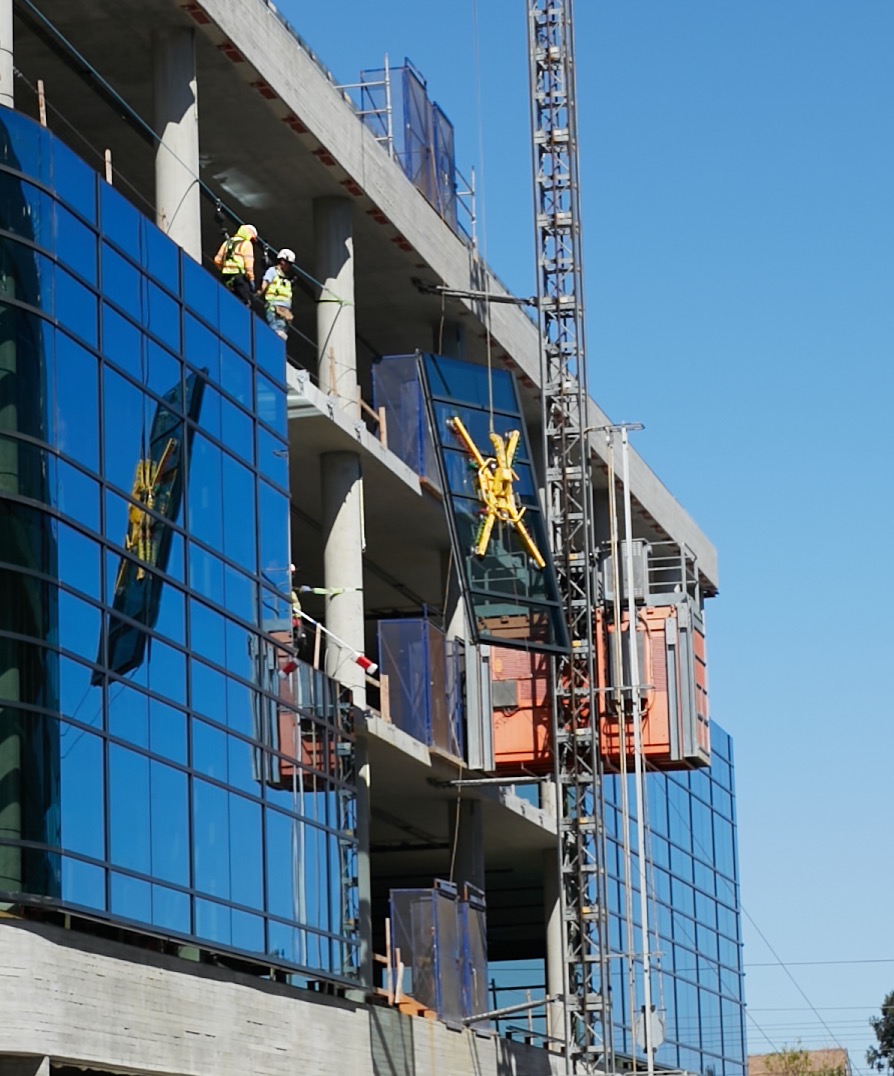 It was a fascinating process. Attached to the end of the crane’s cable was a yellow X-shaped tool that had four large suction cups, one on each tip of the X. The glass was carefully cleaned, after which the suction cups were used to secure the yellow X to the five panes of framed glass. Then the whole assembly was hoisted into place, and a couple of workers inside the building grabbed it and neatly hooked the framed windows onto some metal brackets that had previously been secured to the building’s concrete structure. Finally, the suction cups were detached from the glass — by the crane operator, possibly, or by one of the workers on the ground or in the building via remote control — and the yellow X was lowered back to the ground to pick up the next set of windows.