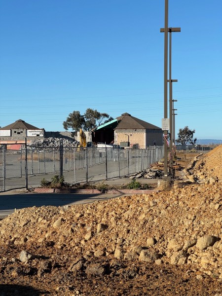 Moving on to what I originally intended to cover in this week’s post, demolition of the Century Park 12 Theatres building continues at a steady pace. As I passed by the project heading north, I paused to watch the piles of sorted scrap — these days when a building like this is demolished, the various types of materials are sorted into piles for recycling — being loaded onto trucks: