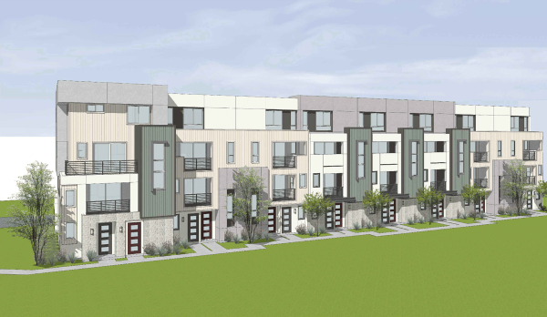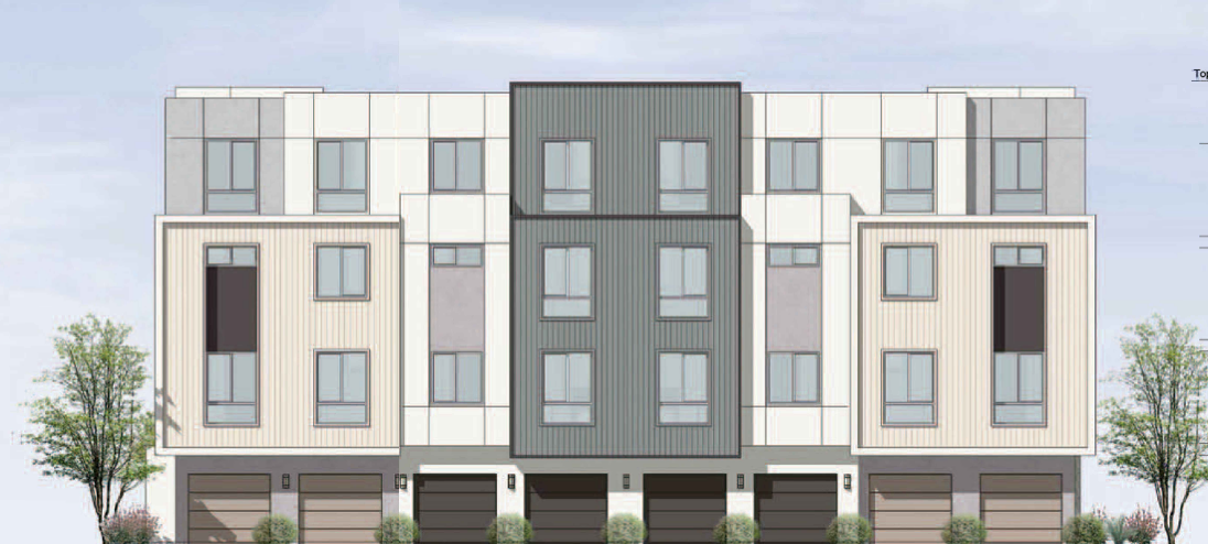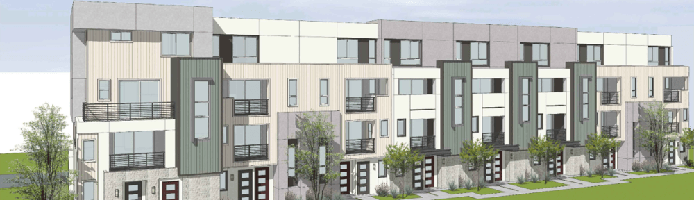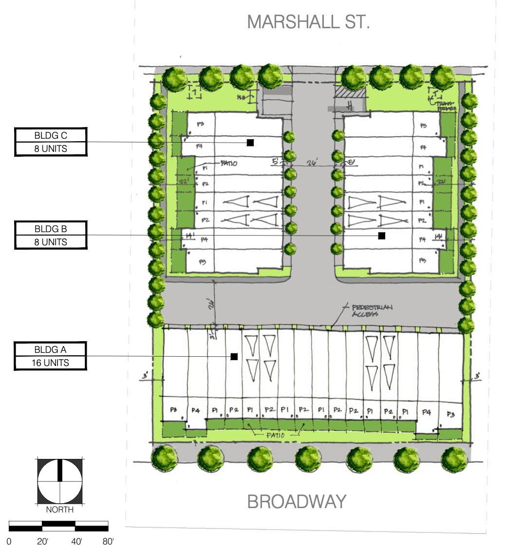Proposed for these spaces would consist of 32 for-sale condominiums, five of which would be affordable at the Moderate income level. The condos would be grouped into three stand-alone buildings, with one, containing 16 condos, spanning the property along the Broadway frontage, and two others, each with eight condos, standing perpendicular to, and behind, the first. The front entrances to the 16 condos in the first building would be directly on Broadway, and would look something like this (with Broadway running where the large green front area is shown; in reality there would be small patios and a narrow planting strip between the buildings and the sidewalk):