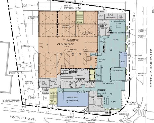 The area on the right, where the pillars stand on the Veterans Boulevard side of the building, all the way to the corner, is where the hotel’s lobby, dining area, and other common areas will be. Along Brewster will be offices, some utility spaces, and a large meeting room that presumably guests can use. The rest — behind those large slab walls from which the forms have been removed, is where the building’s ground-floor parking garage will be located (mechanical stackers will allow the hotel to squeeze 71 cars into that part of the building). For the truly curious, here is the layout of that ground floor:
