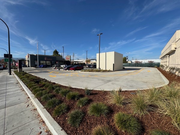 Speaking of restaurant openings, you may have noticed (or heard) that the Chick-fil-A on Whipple Avenue in Redwood City reopened last Tuesday. I happened to be out walking that day, so I went by and took a couple of pictures. Because it opened relatively quietly, with little fanfare beyond two small clusters of red and white balloons out front, there were very few customers when I went by: just three or four cars in the drive-thru, and two or three more parked in the lot. That enabled me to get a couple of pictures of the revamped drive-thru, like this one which shows how the double drive-thru lanes have been stretched to the very edges of the fast-food restaurant’s property: