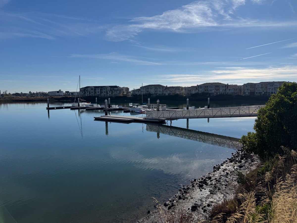 As a reminder (or as news for those who don’t know about this place), one of the project’s public amenities required by the city was a public ramp for hand-launched watercraft (kayaks, canoes, and the like). Although most of the docks in Blu Harbor’s marina are behind a locked gate, that gate is located past the bottom of the ramp leading to the docks on the north side of the marina. And directly at the bottom of that ramp and before that gate you’ll find the public dock from which we members of the public can launch our small watercraft: