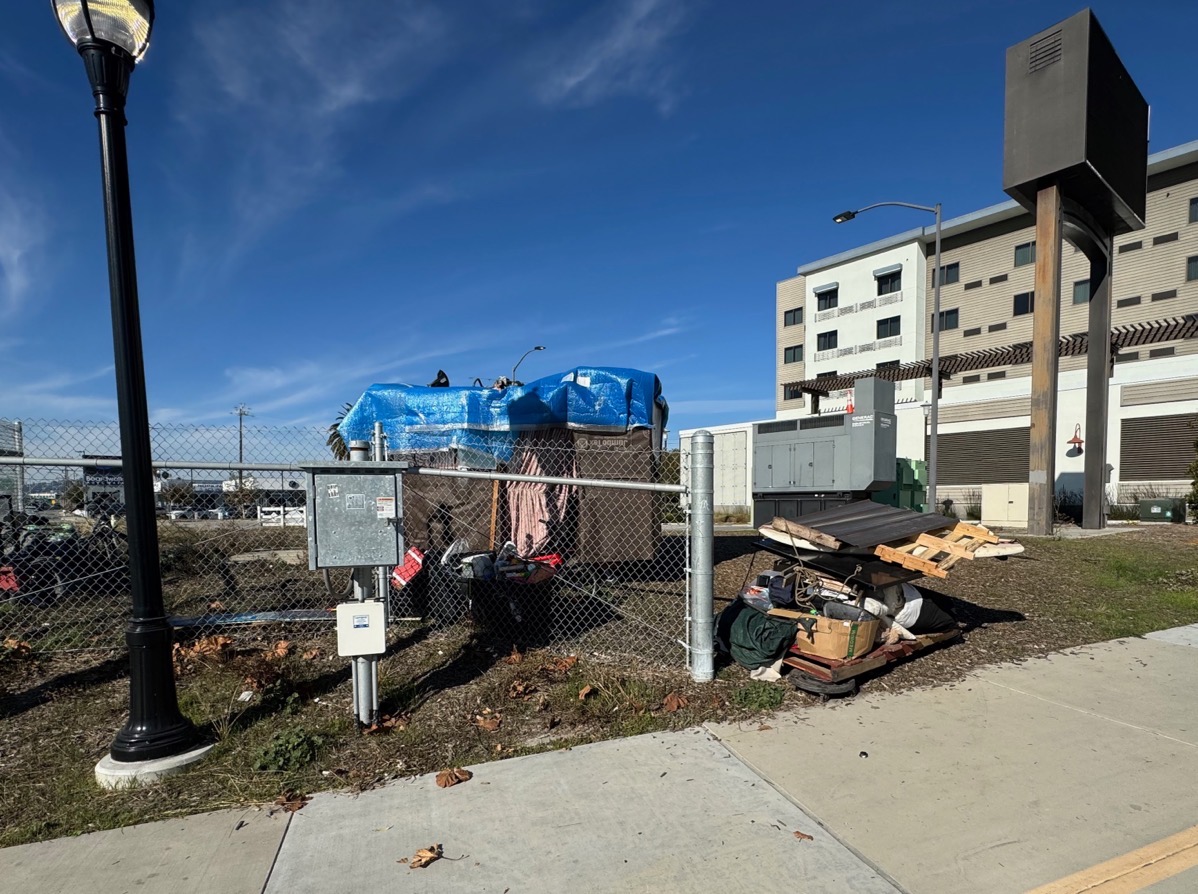 I find it fascinating to see where folks choose to construct these little encampments. Especially when they’ve been moved on from one spot and have to find another. I do have to wonder why they haven’t moved into the county Navigation Center, which is very unlike most other such places. The Navigation Center not only provides secure, single rooms (most with en-suite bathrooms) for residents, it also provides meals and some medical services. And the folks at the Navigation Center aid residents (who can only stay for a couple of months at most) to find more permanent housing. (See my post Navigating the Navigation Center for photos and more information about the center.) Ironically, there is a growing encampment along Maple Street directly behind the Navigation Center itself…
