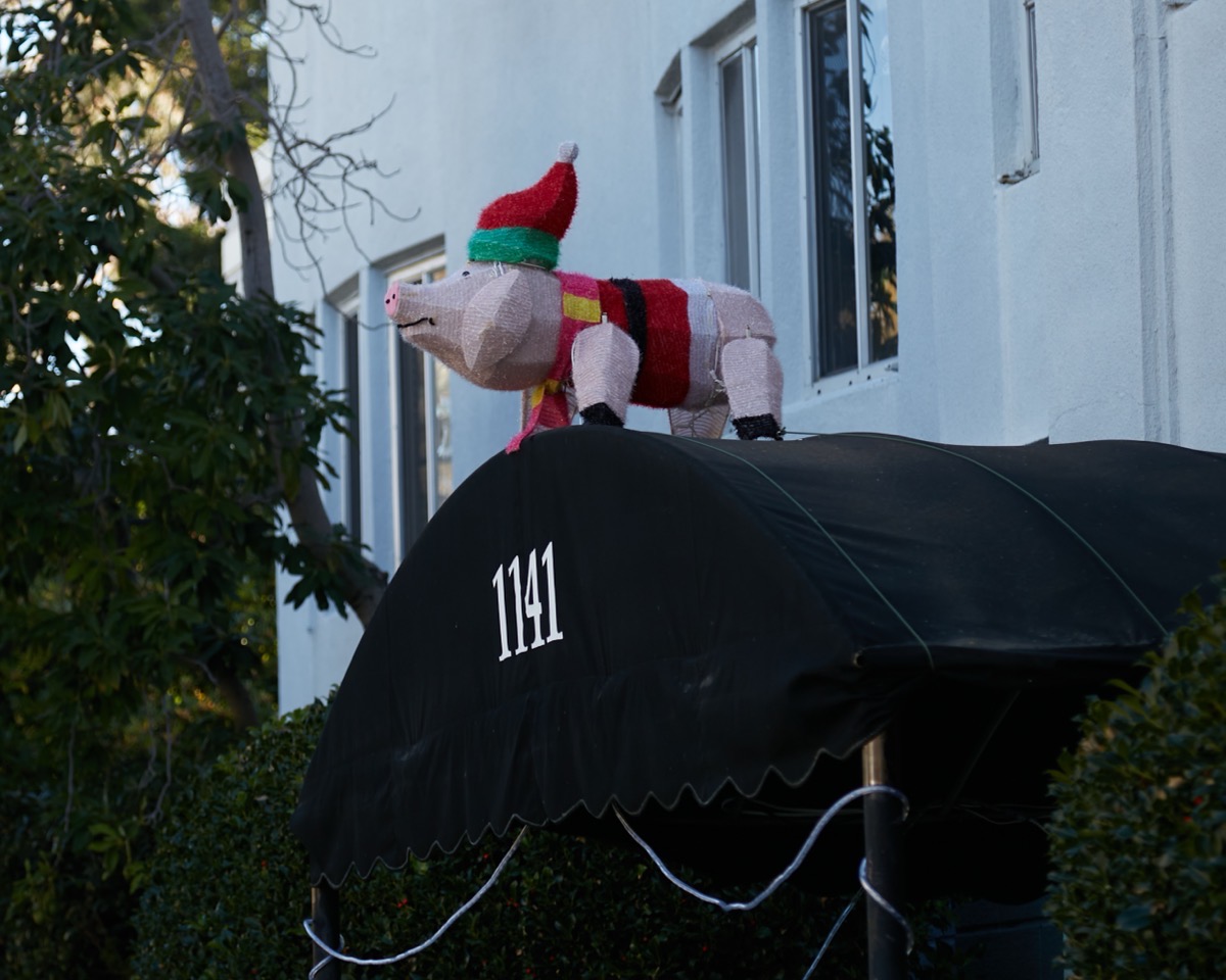 He’s a perennial favorite of mine: he’s been standing atop the entrance to the apartment building at 1141 Whipple Ave. during the holiday seasons for the last several years, at least, and I always keep an eye out for him. There’s something about the idea of a Christmas pig that I find both cute and amusing…