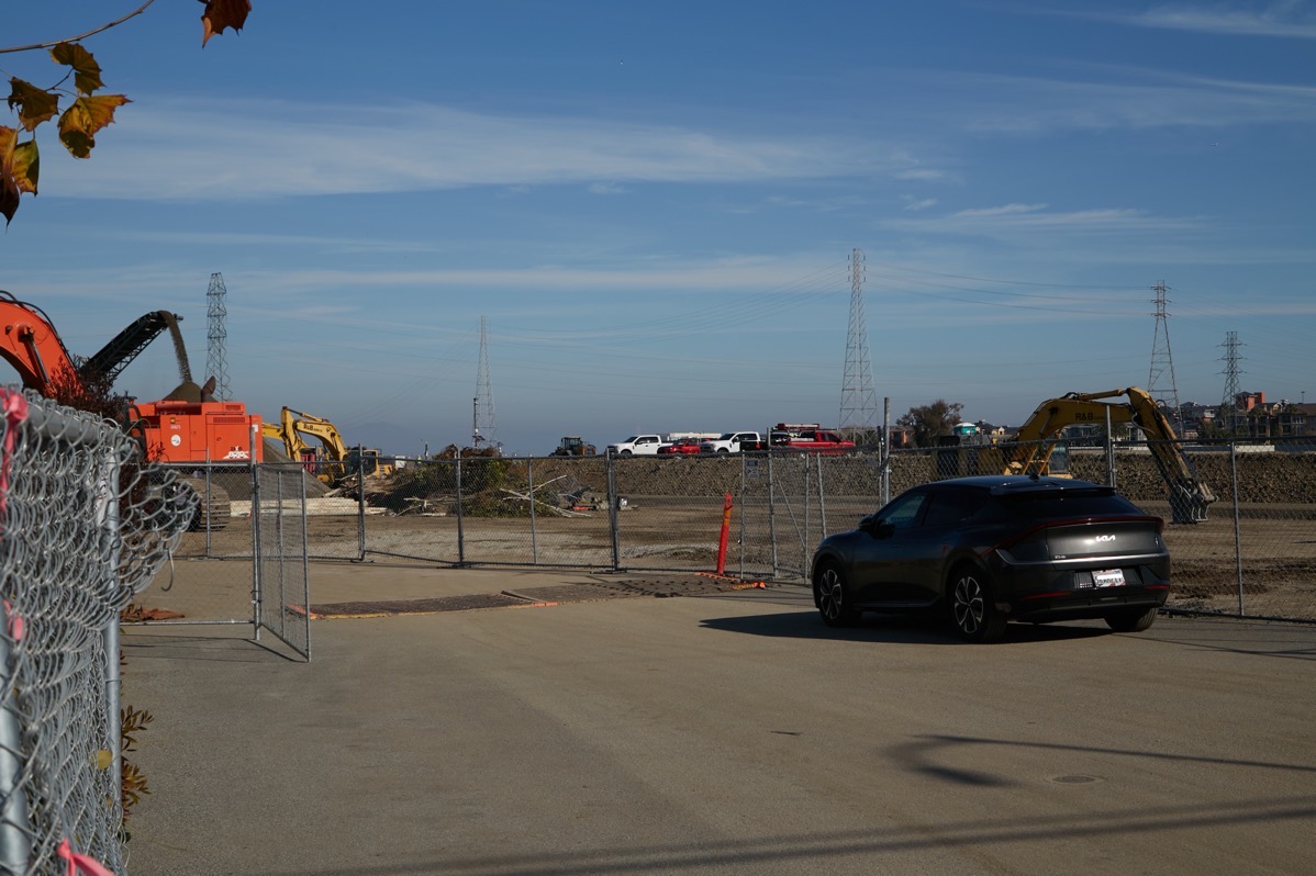 From Chick-fil-A I braved the pedestrian crossing at Whipple Avenue (over Highway 101), as it was by far the shortest way out to my next destination, the Century Park 12 Theatres property at 557 E Bayshore Rd. As you may know, that property, which will be getting two large apartment buildings (with a total of 480 for-rent apartments) and a large (just shy of 100,000 square feet) VillaSport athletic club and spa, is in the process of being elevated to combat anticipated sea-level rise. Although the process is relatively simple — the contractors simply bring in a lot of soil and compact it using a variety of heavy equipment, doing so on a site this large — 14.36 acres — makes for an impressive site. The extent of the site raising is often a bit hard to photograph, but this week I noticed several pickup trucks parked on the half of the property that had been raised so far, making it a bit easier to see just how much the site is being elevated: