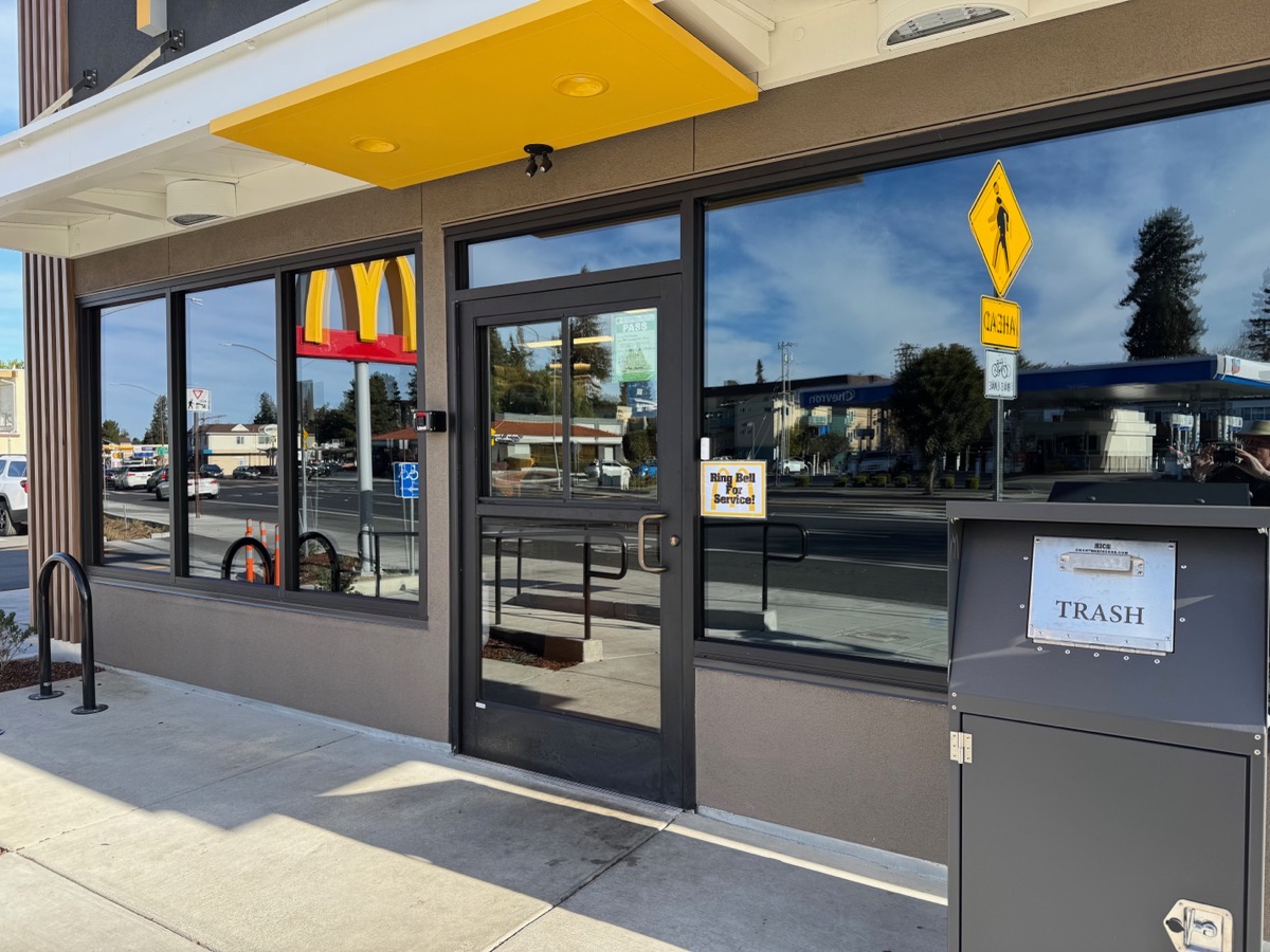 Finally, in an earlier post I said I’d say no more about the Woodside Road McDonalds restaurant unless I discovered whether the new restaurant is truly just a drive-thru. Well, I went by this week and although it has a front door, you can’t go in. However, it does appear that you can order food without going through the drive-thru: the upper half of the building’s front door is a sliding window, and there is a doorbell that you are instructed to “Ring Bell For Service!”