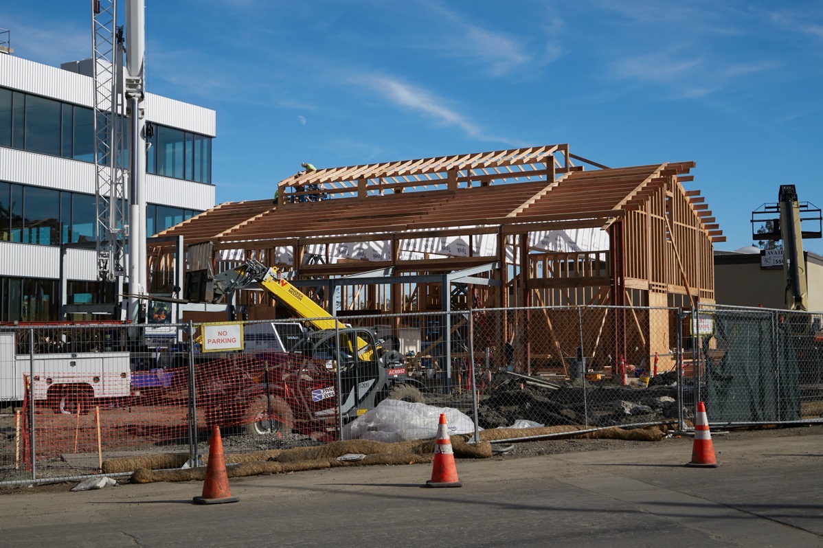 Also on this project, at the corner of Main and Chestnut streets, the size and shape of the free-standing restaurant building is now clearly evident: