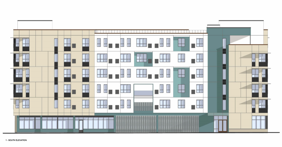 The ground floor would contain a single-level parking garage with 24 spots for motor vehicles and room for 67 bicycles. That level would also contain the building’s lobby, mail room, food pantry, and four of the building’s apartments. The second floor would include a number of apartments plus the building’s community room, offices for the property manager and a case manager, a laundry room, and a south-facing courtyard. Finally, the upper four floors would consist almost entirely of apartments, along with a trash room and utility spaces.