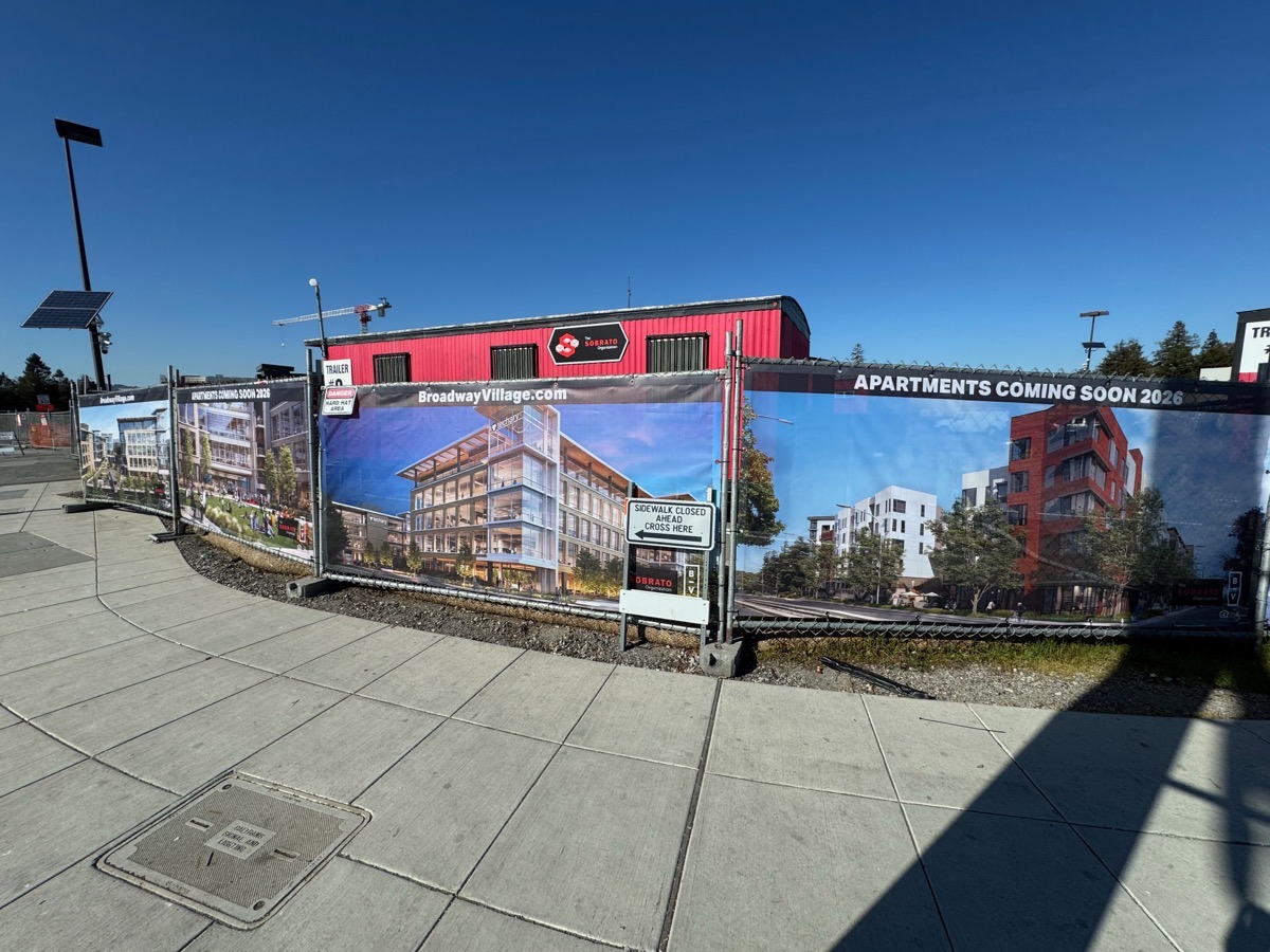 They announce “Apartments coming soon 2026” (I was hoping for 2025, but I guess not). Even more interesting is the fact that they show images of the project’s second phase — the three office buildings that will be constructed at the Woodside Road end of the property — along with a link to BroadwayVillage.com, a somewhat interactive website that shows off various details of both parts of the project. To me this is a strong signal that the developer really does intend to move ahead with the second phase upon completion of the first (the three residential buildings). Although the developer will surely want to get those residential buildings occupied (and, thus, generating income) as soon as possible, the half of the large underground garage that will sit beneath the office buildings has yet to be constructed, and the developer may want to at least get that part done before opening the nearby residences to tenants. We’ll see…