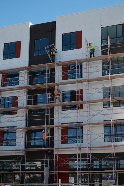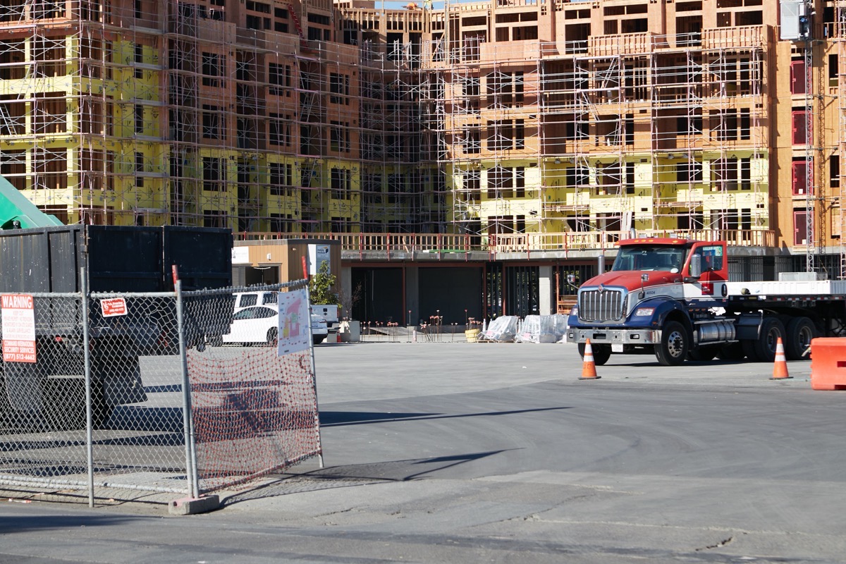 Speaking of large apartment buildings, I of course also checked in on the Broadway Plaza project, on Broadway between Chestnut Street and Woodside Road. Progress-wise, I don’t have a great deal to report, other than I watched as some of the scaffolding surrounding the fully affordable residential building that faces Chestnut Street was being taken down:
