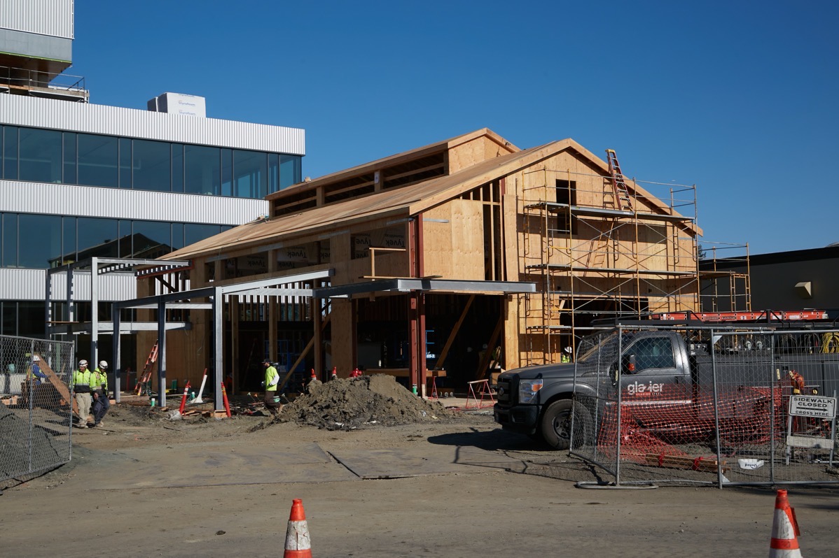 I of course walked by the ELCO Yards construction site this week, and took some updated photographs. The restaurant building — the basic structure of which you can see in the above photo — is now looking a lot like the final building (minus its exterior skin, of course):