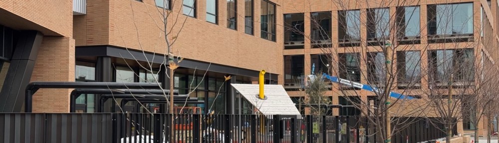 As well, the play equipment in the fenced-in outdoor portion of the childcare center that will be located along Cedar near El Camino Real has apparently been installed: