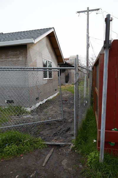 As you can see, the buildings are fairly far along: they have shingled roofs, gutters, doors, and windows. The exteriors are tar-papered and have stucco mesh applied, but stand waiting for the stucco itself. These are just the kind of places that would attract someone who otherwise might live in a makeshift encampment, or kids looking for a place to fool around. Which may have been what happened last Saturday. I took the above picture on Tuesday, after the fire, and as you can see, there isn’t much evidence visible from Vera Avenue. That’s because the fire occurred in the unit at the very far end of the left-hand row (this development has the buildings arranged in a ‘U’, with two buildings on the left, two buildings on the right, and one duplex building at the base of the ‘U’). That particular unit is probably the most discreet; it is one of the hardest to see from the street, and thus the ideal spot to “move in” without attracting too much attention. As for how one gets in and out relatively unobserved, there is an alley that runs right behind the development, connecting Adams Street with El Camino Real. And although there is a construction fence back there as well, given that no one representing the owner seems to have been keeping a close eye on the place, that construction fence proved to be no obstacle: