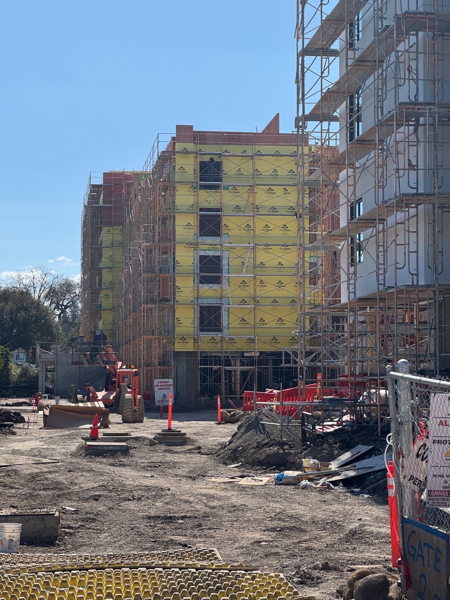 As you can see, the building (comprised of two towers, it seems, containing a total of 104 apartments) is nearly ready for its exterior finishes. And based on photos from just before the fire, it appears that the work crews have advanced the project beyond where it was when it burned. Which is certainly something worth celebrating. It still has quite a way to go, but I was really pleased to see how much progress has been made on this badly needed housing project.