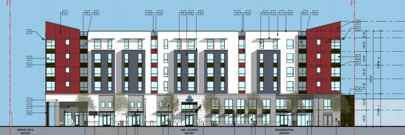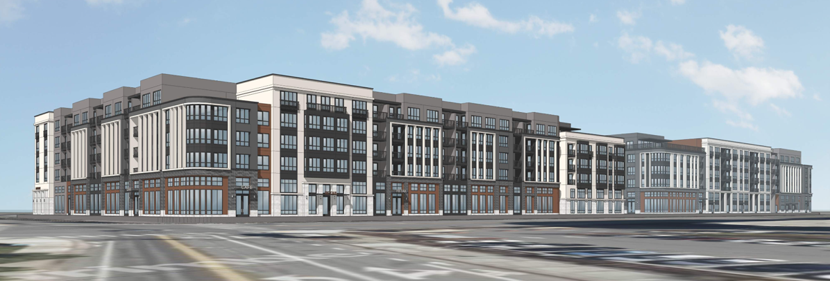 This is a large mixed-use project proposed for the 5.3-acre site of the Veterans Square shopping center (where Hoot Judkins Furniture is located). The development would contain 409 for-rent apartments, 70 of which would be offered at below-market rates. It would include 5,600 square feet of retail space, plus a 5,300 square foot childcare center.