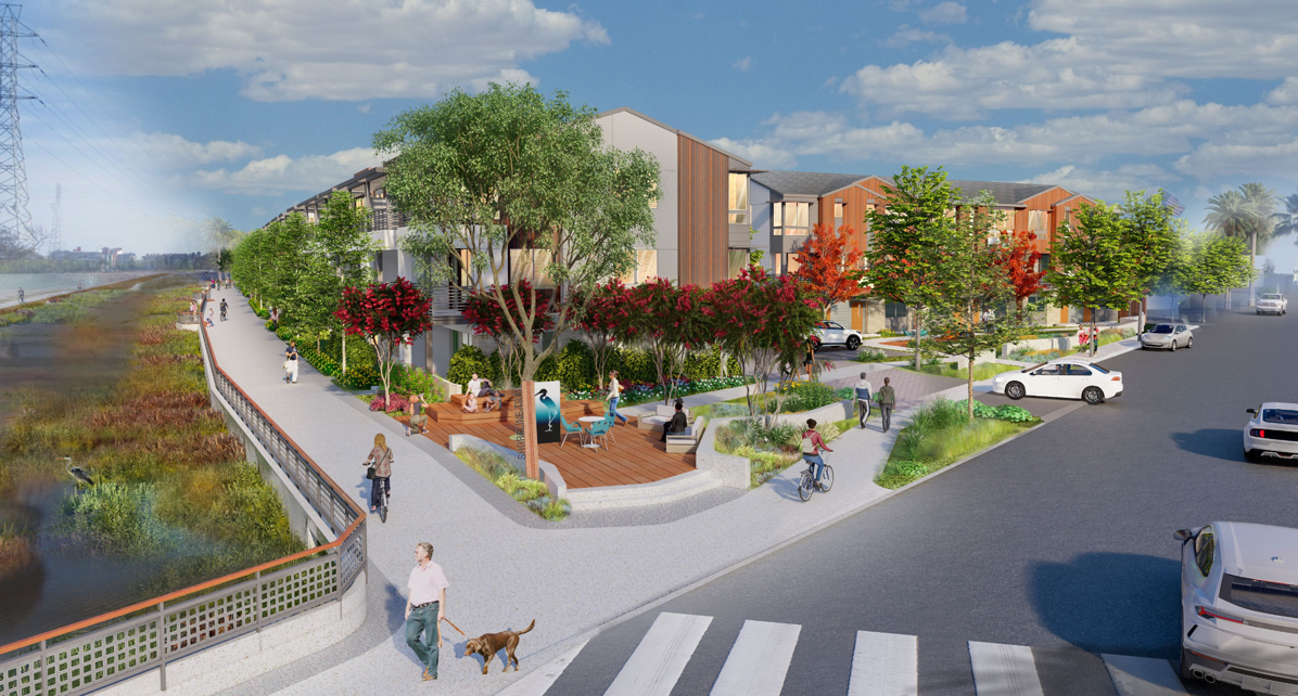 This project would replace the Alan Steel & Supply Company facilities, located near the east end of Whipple Avenue, with a 56-unit townhouse complex. Twenty of those townhouses would be grouped into three buildings that would face directly out over Bair Island. The remainder would be located in one of six buildings, each containing six townhouses, that would be behind and end-on to the ones facing the wetlands.