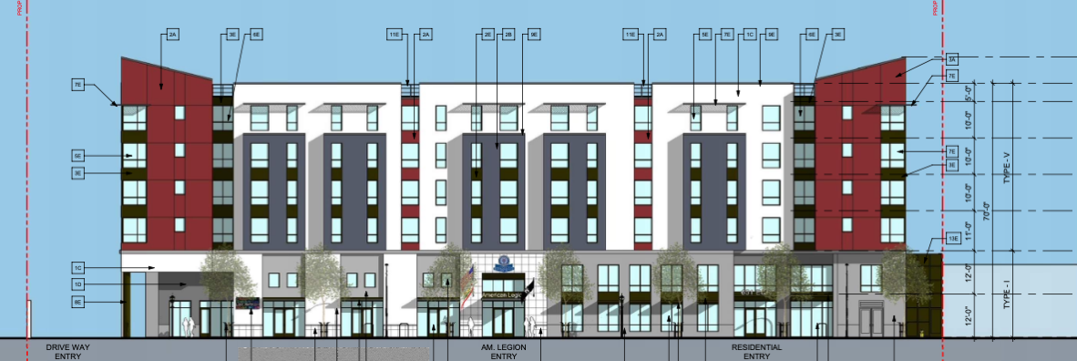 Today the site of American Legion Post #105’s hall, the proposed project calls for a six-story building containing a new American Legion hall (which could also be rented for City and private functions), veteran support offices, and a parking garage on the first two floors. The upper four floors would contain 135 affordable housing units and one manager’s unit.