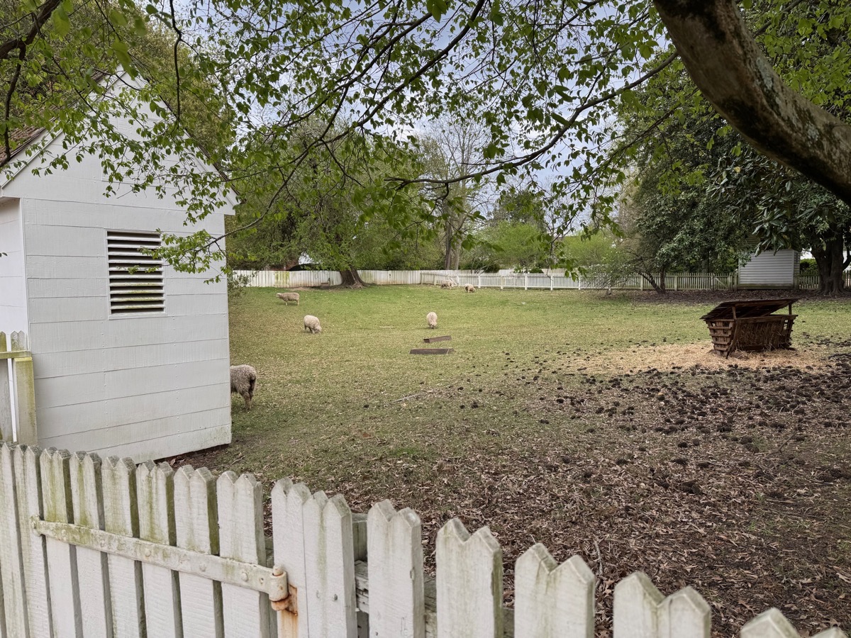 Folks living and building homes and buildings in Colonial Williamsburg back in the day clearly didn’t have to deal with zoning laws. Not only is that theater flanked on both sides by houses, the corner nearest the Governor’s Palace consists largely of a fenced field where sheep are being kept: