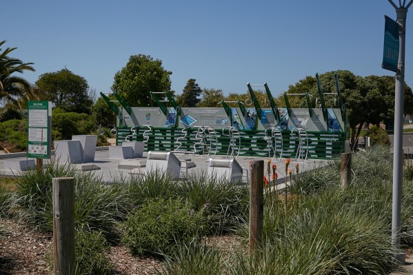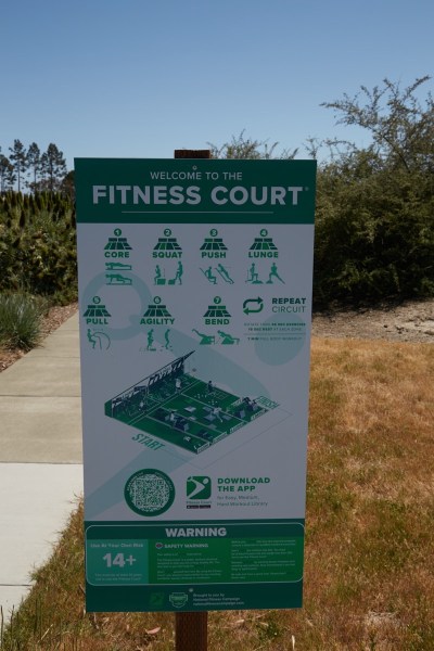 Sticking with Redwood Shores, some time ago I had noticed some work being done at the northern end of the parking lot for the Redwood Shores branch of the Redwood City Public Library (at the corner of Marine Parkway and Bridge Parkway). This week I checked back, and it turns out that the work was being done to install a terrific new outdoor “fitness court”: