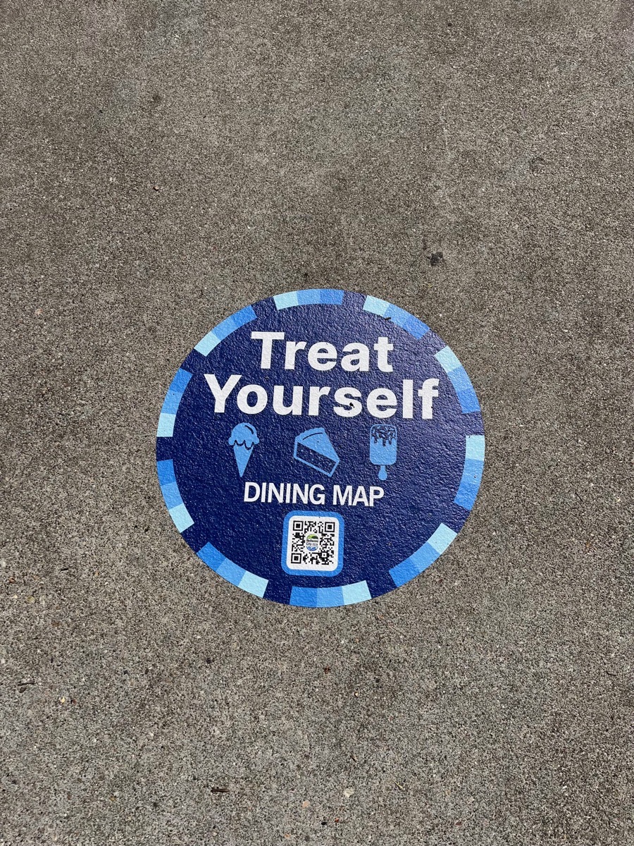 Lastly, some stickers have started appearing on the ground in downtown Redwood City (these two can be found at either end of the crosswalk across Main Street close to The Baker Next Door). One has a QR code that enables your phone to pull up a map of downtown Redwood City’s dining establishments: