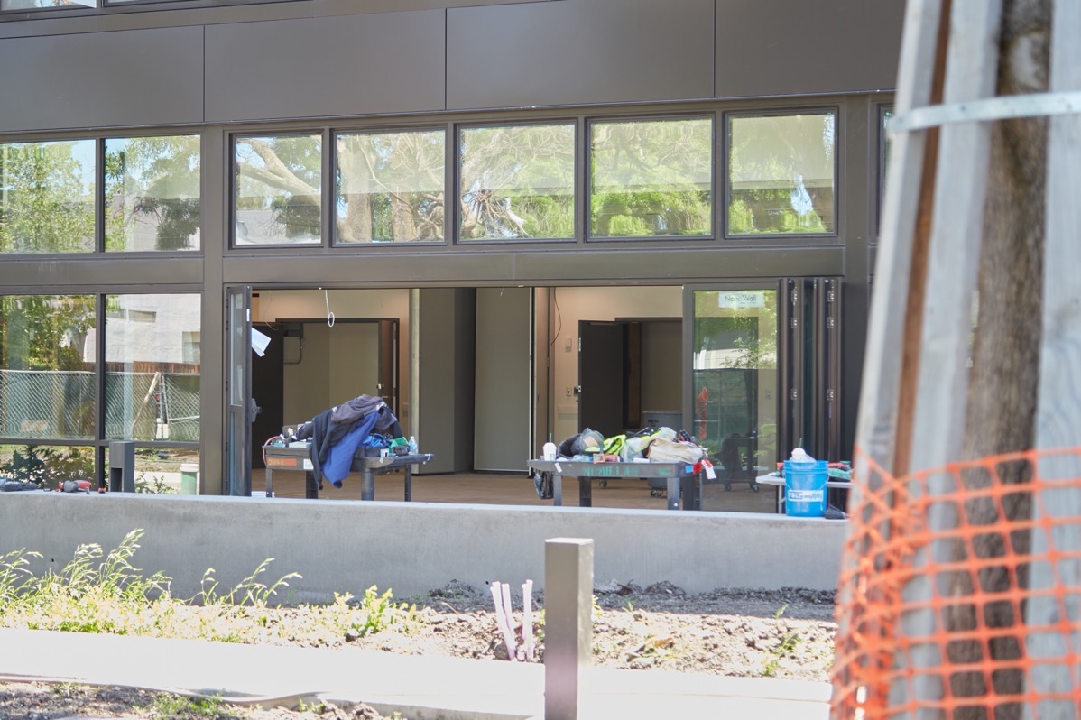 With some of the building’s large window/doors open to allow some fresh air inside, I was able to get a nice glimpse of the ground-floor multi-purpose/dining room, which looks about ready for use: