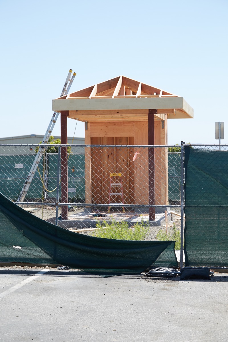 And a former planting area that ran down the center of the parking lot has been widened, apparently to be turned into an outdoor rest and relaxation space for the building’s residents. In the middle of this new space, though, a rather odd-looking structure is being constructed: